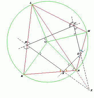 Обозначим через O точку пересечения перпендикуляров. опущенных из точки K на AB, из L на BC, из M на CD. Обозначим также ∠BAK = ∠DAN = α,