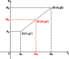 Если M(x0, y0) – середина отрезка с концами в точках A(x1, y1) и B(x2, y2) и при этом x1 ≠ x2 и y1 ≠ y2, то проекции Mx и My точки M на оси OX и OY – середины отрезков AxBx и AyBy. Поэтому x0 = ½ (x1 + x2), y0 = ½ (y1 + y2).