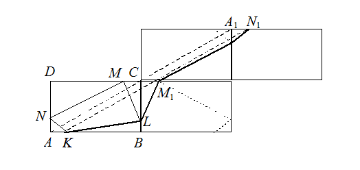 Трижды отразим прямоугольник ABCD с вписанным в него четырёхугольником KLMN (см. рис.).