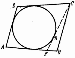 Проведем из точки C касательную к окружности (рис.). Получили описанный четырехугольник. Суммы противоположных сторон его равны: BC+AE=AB+CE . Сумма противоположных сторон четырехугольника