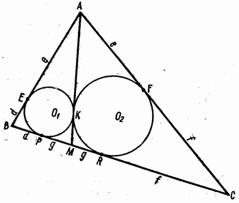 Обозначим стороны треугольника a,b,c . Пусть точки касания E,P,K,R,F; EA=AK (касательные из точки A к кругу O1 ), AK=AF (касательные к кругу O2 из точки A ), следовательно, EA=FA . Аналогично PM=MK, MK=MR, PM=MR . Далее, EB=BP (касательные к кругу O1 проведенные из точки B ), CF=CR . Обозначим BE=BP=d, EA=AF=e, FC=CR=f , RM=MP=g . Нам нужно выразить через стороны треугольника отрезок BM=BP+PM=d+g . BA+CA+CB=a+b+c=BE+EA+AF+FC+CR+RM+MP+PB=d+e+e+f+f+g+g+d=2(d+e+f+g) .