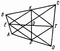 Соединим последовательно середины сторон данного четырёхугольника E , K,T,P (рис.). Полученный четырёхугольник EKTP есть ромб, ибо его стороны равны половинам диагоналей как средние линии треугольников ABC,ADC,BCD , ABD , а диагонали данного четырёхугольника по условию равны a . Далее средние линии указанных треугольников отсекают от них треугольники с площадью, в 4 раза меньшей, чем площади этих треугольников, т.е. S BEK=1/4S BAC, S PTD=1/4S ACD, S KCT=1/4S DBC, S AEP=1/4S ABD . Сложив площади первых двух треугольников, а затем вторых, получим: