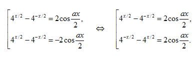 4x+ 4–x= 2 cosax+ 4 ⇔ 4x– 2 + 4–x= 2(1 + cosax) ⇔ (2x– 2–x)2= 4cos2 ax/2) ⇔