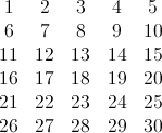 Покажем, что n может равняться 25. Занумеруем учеников числами от 1 до 30 в порядке ухудшения успеваемости и расположим номера в таблице 6×5 так, как показано на рисунке.