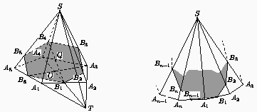 Так как n-угольная пирамида имеет n + 1 грань, то стороны сечения находятся по одной в каждой грани пирамиды. Поэтому без ограничения общности можно считать, что точки B1, ..., Bn+1 расположены на ребрах пирамиды так, как показано на рисунках (в соответствии с указанными случаями).