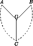 Предположим, что в этом графе есть два пересекающихся (по вершине) цикла (см. рис.). Рассмотрим вершину O, в которой они разветвляются. Эта вершина, очевидно, имеет степень 3. Удалим её и три выходящих из неё ребра OA, OB, OC. При этом граф сохранит связность, так как существует путь, соединяющий вершины A, B и C.