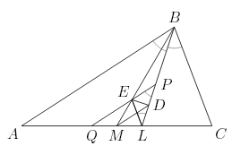 MO : MA = ME : MB = ML : MC, поэтому MQ = ML. Следовательно, MD – средняя линия треугольника PLQ, то есть ED – медиана треугольника PEL. Из параллельности EP и EL сторонам AB и BC соответственно следует равенство углов: ∠EPL = ∠ABL = ∠LBC = ∠ELP. Тем самым, треугольник LEP – равнобедренный, и медиана ED является высотой.