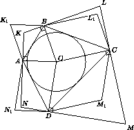 Четырехугольник ABCD описан около окружности. Биссектрисы внешних углов A и B пересекаются в точке K , внешних углов B и C – в точке L , внешних углов C и D – в точке M , внешних углов D и A – в точке N . Пусть K1 , L1 , M1 , N1 – точки пересечения высот треугольников ABK , BCL , CDM , DAN соответственно. Докажите, что четырехугольник K1L1M1N1 – параллелограмм.