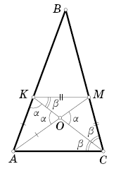 Пусть ∠AKO = ∠AOK = ∠MOC = α, ∠MKC = ∠MCK = ∠ACO = β (рис. слева). Далее можно рассуждать по-разному. Первый способ. В треугольниках KCA и OCM две пары соответственно равных углов, поэтому и третьи углы равны: ∠CAK = ∠CMO = ∠AMC. Заметим, что ∠MKB = ∠CAK и ∠ACM = ∠KMB. Значит, треугольники AMC и BKM равны по стороне и двум углам. Следовательно, AM = KB.