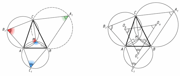 YT : TZ = 1 : 2, провести прямую, параллельную стороне XY (рис. слева), то эта прямая пройдёт через точку O и ∠ZOT = 90°. Отметим на сторонах AB и AC данного треугольника ABC такие точки K и L, что BK : AK = 1 : 2 и CL : AL = 1 : 2 (рис. справа). Тогда KL || BC, а середина M отрезка KL – точка пересечения медиан треугольника ABC. Построим внешним образом на сторонах AK и AL треугольника AKL как на гипотенузах прямоугольные треугольники AC1K и AB1L с углами 60° при вершинах K и L. Тогда точки C1 и B1 – центры правильных треугольников, о которых говорится в условии задачи. Согласно задаче 211667 MC1 = MB1 и ∠B1MC1 = 2∠ALB1 = 120°. Если A1 – центр равностороннего треугольника, построенного внешним образом на стороне BC, то аналогично MA1 = MB1 и ∠A1MB1 = 120°. Следовательно, A1B1C1 – равносторонний треугольник, а M – его центр.