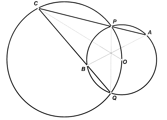 Если C совпадает с O, утверждение очевидно, а если C – точка, диаметрально противоположная O, то ∠CPO = ∠CQO = 90°, то есть прямые CP, CQ касаются второй окружности и точки A, B совпадают с P, Q. В остальных случаях, так как OP = OQ, то CO – биссектриса угла ACB. При симметрии относительно CO прямые CP и CQ переходят друг в друга, а вторая окружность в себя, следовательно, точка P переходит либо в Q, либо в B. Но