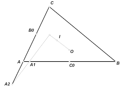 A1I = IC. Аналогично A2I = IB. Следовательно, A1I² – A2I² = IC² – IB² = (p – c)² – (p – b)² = a(b – c). С другой стороны, если B0, C0 – середины AC и AB, то