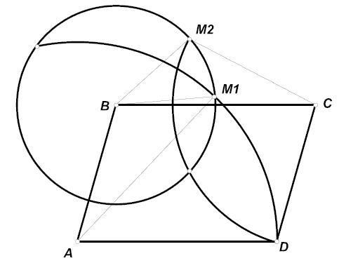 Дан параллелограмм ABCD, в котором AB = a, AD = b. Первая окружность имеет центр в вершине A и проходит через D, вторая имеет центр в C и проходит через D. Произвольная окружность с центром B пересекает первую окружность в точках M1, N1, а вторую – в точках M2, N2. Чему равно отношение M1N1 : M2N2?