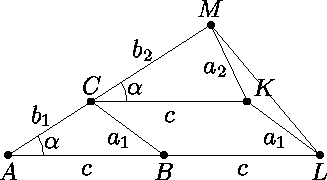 поэтому угол α1 лежит против нее и является острым. Рассмотрим треугольник AML с углом α при вершине A и боковыми сторонами AM = b1 + b2 , AL = c + c (рисунок).