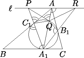 ∠A1B1Q = ∠BA1A = ∠A1AR = ∠QAR. Значит, четырёхугольник ARB1Q – вписанный. Аналогично вписанным является и четырёхугольник PAQC1. Следовательно, ∠PQR = ∠PQA + ∠RQA = ∠PC1A + ∠RB1A = ∠A1C1B + ∠A1B1C = ∠A1QC1 + ∠A1QB1 = ∠B1QC1.