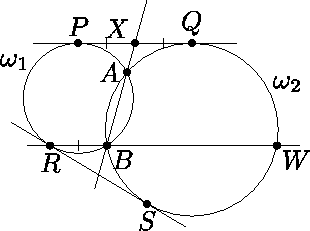 Две окружности σ1 и σ2 пересекаются в точках A и B . Пусть PQ и RS – отрезки общих внешних касательных к этим окружностям (точки P и R лежат на σ1 , точки Q и S – на σ2 ). Оказалось, что RB|| PQ . Луч RB вторично пересекает σ2 в точке W . Найдите отношение RB/BW .