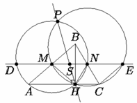 Пусть прямая MN вторично пересекает описанные окружности Ω1 и Ω2 треугольников AHN и CHM в точках D и E, а прямую PH – в точке S. Поскольку HN– медиана прямоугольного треугольника BHC, то HN = CN и ∠NHC = ∠NCH. Из параллельности хорд ME и HC окружности Ω2 следует, что четырёхугольник MHCE – равнобокая трапеция, поэтому HM = CE и ∠MHC = ∠ECH. Следовательно,