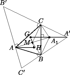 В неравнобедренном треугольнике ABC точки H и M – точки пересечения высот и медиан соответственно. Через вершины A, B и C проведены прямые, перпендикулярные прямым AM, BM, CM соответственно. Докажите, что точка пересечения медиан треугольника, образованного проведёнными прямыми, лежит на прямой MH.
