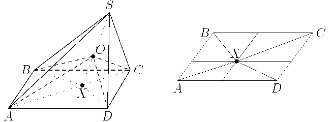 пирамиды, то точка X лежит внутри ее основания. При этом SXAB + SXCD = SXBC + SXDA (одно из возможных доказательств этого факта усматривается из рис. — каждая из сумм