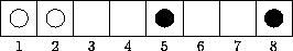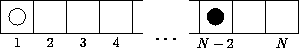 В этой игре Белые, бесспорно, имеют преимущество, хотя иногда они и проигрывают. Клетки поля мы для удобства иногда будем нумеровать слева направо:1, 2, 3, .. (N-1), N . В пункте "а" приN=3Белые проиграют (этот тривиальный случай многие "прозевали"), а в остальных случаях — победят, передвинув шашку с клетки1на клетку(N-2). Эта атака — поставить свою шашку за одну клетку до шашки противника — будет часто в дальнейшем применяться Белыми. В пункте "б" Белые тоже, казалось бы, должны идти с клетки 2 на(N-3). Однако, такой ход возможен только еслиN-3>2, то естьN>5. В этом случае у Чёрных только один ход, следует размен, и возникает положение (рис. 5). Теперь Белые ходят с 1 на(N-4)(это возможно, так какN-4>1приN>5) и выигрывают.
