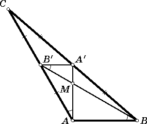 Пусть в треугольнике ABC выполнено неравенство 1 = AB < AC < BC. Тогда медиана AA' равна высоте, опущенной из вершины B, а медиана BB' – высоте, опущенной из вершины C. Значит, расстояние от точки A' до прямой AC равно половине AA', то есть ∠A'AC = 30°. Аналогично ∠B'BA = 30°.