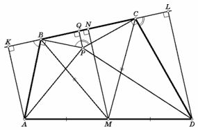 Проведём перпендикуляры AK, DL, MN и PQ – к прямой BC (см. рис.). KN = NL, а BN = NC. Следовательно, KB = CL. Заметим, что прямоугольные треугольники AKB и BQP подобны. Аналогично подобны прямоугольные треугольники CLD и PQC.