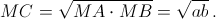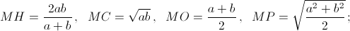 Точка M лежит вне окружности с центром O. Прямая OM пересекает окружность в точках A и B, прямая, проходящая через точку M, касается окружности в точке C, точка H – проекция точки C на AB, а перпендикуляр к AB, восставленный в точке O, пересекает окружность в точке P. Известно, что MA = a и MB = b. Найдите MO, MC, MH, MP и расположите найденные значения по возрастанию.