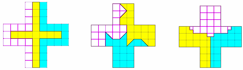 Разрежьте крест, составленный из пяти одинаковых квадратов, на три многоугольника, равных по площади и периметру.