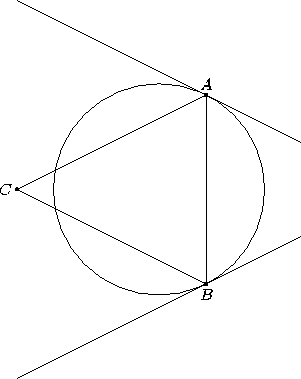 Пусть C – данная точка, A, B – точки на окружности (см. рис.). Если касательная к окружности в точке A не параллельна CB, то, переместив точку A, можно увеличить расстояние от неё до BC, а значит, и площадь треугольника. Аналогично касательная в точке B параллельна CA. Следовательно, прямые AC и BC симметричны относительно серединного перпендикуляра к AB, то есть AC = BC.