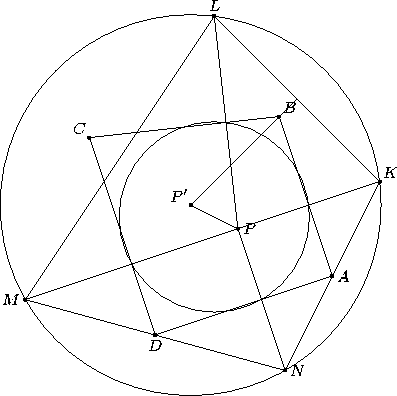 Пусть теперь K, L, M, N – точки, симметричные P относительно AB, BC, CD, DA. Так как, например, BK = BP = BL, серединный перпендикуляр к KL совпадает с биссектрисой угла KBL, то есть прямой BP' (см. рис.). Значит, P' – центр окружности, проходящей через точки K, L, M, N. Применив гомотетию с центром P и коэффициентом ½, получаем, что середина отрезка PP' – центр окружности, проходящей через проекции P на рёбра основания.