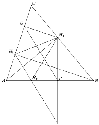 Пусть CHc – третья высота треугольника. Тогда ∠HaHcB = ∠C = ∠HbHcA. Следовательно, точка, симметричная Ha относительно AB, лежит на прямой HbHc. Аналогично на этой же прямой лежит точка, симметричная Ha относительно AC. Соответственно, точки P, Q лежат на средней линии треугольника HaHbHc (см. рис.).