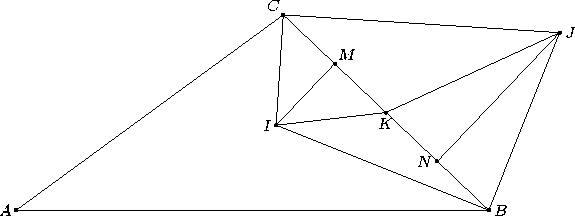 ∠IKJ = 180° – ½ ∠A, состоит из двух дуг с концами I и J. Эти два ГМТ пересекаются в четырёх точках, расположенных симметрично относительно отрезка IJ и серединного перпендикуляра к нему. Четыре четырёхугольника BICJ, соответствующие этим точкам, равны, то есть условие