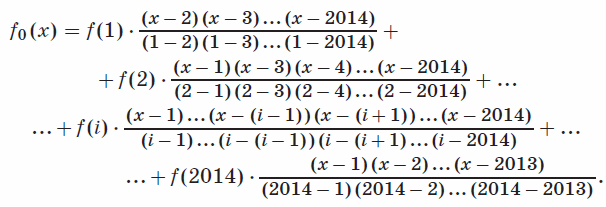 Решение 2: Выпишем интерполяционный многочлен Лагранжа, который совпадает с f(x) в точках 1, 2, ..., 2014 (см. задачу 161051):