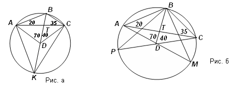 Аналогично, так как ∠ВKА = ∠ВСА = 35°, а ∠ВDА = 70°, то ∠KАD = 35°, то есть DK = DA. Второй способ. На луче AD отметим точку М так, что отрезок DM = DB (рис. б). Тогда ∠ DВM = ∠BMD = ½ ∠ВDА = 35° = ∠ВСА, следовательно, точки A, B, C и M лежат на одной окружности.