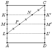 Пусть дан квадрат ABCD. Первый способ. Разделим стороны AB и BC на две равные части. Для этого согнём его так, чтобы точка A совпала с точкой B, а затем так, чтобы точка B совпала с точкой C. Cгибая квадрат по отрезкам CM и AK (медианам треугольника ABC), построим L – точку пересечения его медиан (рис. слева). Затем согнём квадрат так, чтобы сторону AB прошла через точку L и при этом образ B' точки B попал на отрезок BC. Обозначим линию сгиба NN'. Тогда, поскольку ML = ⅓ MC, то по теореме Фалеса BB' = ⅓ BC = ⅓, следовательно, BN = B'N = ⅙ и NC = ⅚.