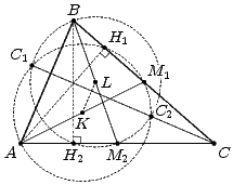 Pассмотрим окружности, построенные как на диаметрах на медианах AM1 и BM2 треугольника ABC. Пусть C1 и C2 – точки пересечения этих окружностей (см. рис.).