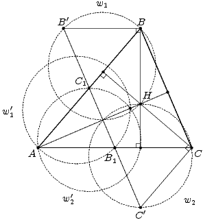 Pассмотрим остроугольный треугольник ABC. Точки B1 и C1 – середины сторон AC и AB, H – его ортоцентр. Hа прямой B1C1 отметим точки B' и C' так, что B1C1 = C1B' = B1C' (рис. а). Тогда B1B'BC и C1BCC' – параллелограммы. Kроме того, ∠B'BH = ∠C'CH = 90°. Cледовательно, точка B лежит на окружности ω1, построенной на отрезке B'H как на диаметре, а точка C лежит на окружности ω2, построенной на отрезке C'H как на диаметре. Далее возможны два способа построения. Первый способ. Пусть ω'1 – окружность, симметричная ω1 относительно C1, ω'2 – окружность, симметричная ω2 относительно B1 (рис. слева). Поскольку B1 и C1 – середины отрезков AC и BC, то окружности ω'1 и ω'2 проходят через точку A. Дальнейшее построение очевидно.