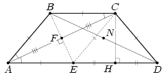 CN = NK = NH, то есть ∠CHK = 90°, что и требовалось. Третий способ. Пусть N и F – середины диагоналей BD и AC, прямая BF пересекает основание AD в точке E.