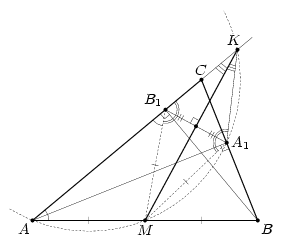M – середина AB, значит, AM = MB1 = MA1. Так как равные хорды стягивают равные дуги, то KM – биссектриса угла AKA1. Также ∠KB1M = 180° – ∠AB 1M = 180° – ∠B1AM = ∠KA1M. Значит, треугольники KB1M и KA1M равны, и KB1 = KA1, что и требовалось. Для точки L доказательство аналогично.