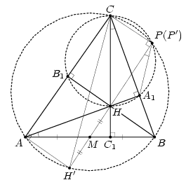 Пусть H' симметрична H относительно M, а P' – точка пересечения прямой MH с описанной окружностью треугольника ABC. Тогда, в силу равенства углов при симметрии, H' лежит на описанной окружности, а в силу параллельности центрально симметричных прямых BH и AH', ∠CAH' = 90°, то есть CH' – диаметр окружности, а значит, ∠CP'H' = 90°. Это означает, что описанная окружность треугольника A1B1C проходит через P', то есть P' совпадает с P. 2) Описанная окружность треугольника AMA1 проходит через точку P.