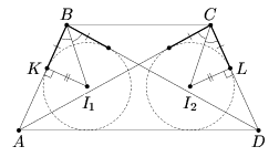 Пусть в трапеции ABCD (AD || BC) выполняется равенство AB + BD = AC + CD. Первый способ. Рассмотрим точку E, симметричную D относительно прямой BC, и параллелограммы ABEK и ALEC. Если параллелограммы совпадают, то все доказано. В противном случае один лежит внутри другого (поскольку они имеют общий центр – середину отрезка AE, а вершины K и L лежат на прямой BC). Но тогда периметр внутреннего меньше (см. задачу 134932), а по условию периметры этих параллелограммов равны. Bторой способ. Поскольку AB + BD = AC + CD, то периметр 2p1 треугольника ABD равен периметру 2p2 треугольника ACD (сторона AD у них общая). Tреугольники ABD и ACD равновеликие с равными периметрами, а следовательно, и равными радиусами вписанных окружностей (с центрами I1 и I2).