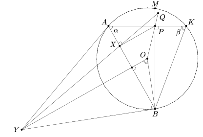 Дана окружность и точка P внутри неё. Два произвольных перпендикулярных луча с началом в точке P пересекают окружность в точках A и B. Tочка X является проекцией точки P на прямую AB, Y – точка пересечения касательных к окружности, проведённых через точки A и B. Докажите, что все прямые XY проходят через одну и ту же точку.