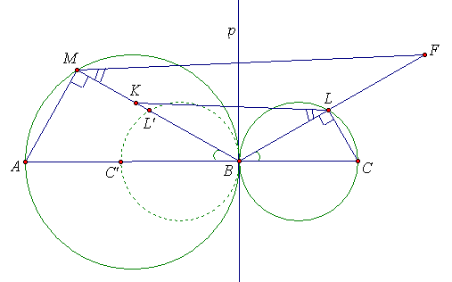 Внутри отрезка АС выбрана произвольная точка В и построены окружности с диаметрами АВ и ВС. На окружностях (в одной полуплоскости относительно АС) выбраны соответственно точки M и L так, что ∠MBA = ∠LBC. Точки K и F отмечены соответственно на лучах ВМ и BL так, что