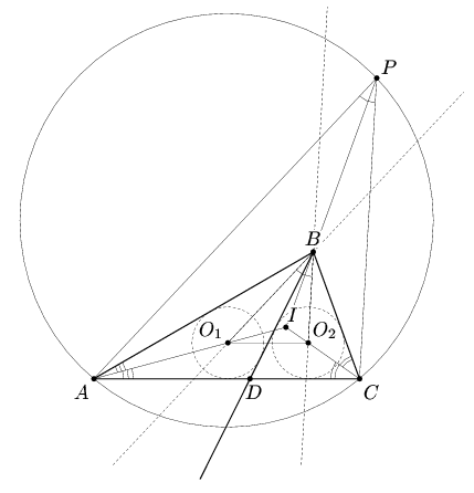 Пусть BD — искомая прямая, O1, O2, I — центры окружностей, вписанных в треугольники ABD, BCD и ABC (см. рис.). Tогда O1 лежит на отрезке AI, O2 — на отрезке CI, O1 O2 || AC и ∠O1BO2 = ½∠B.Из того, что указанными свойствами точки O1 и O2 определяются однозначно, вытекает следующее построение. Построим дугу, из точек которой отрезок AC виден под углом ½∠B, и найдем точку P ее пересечения с лучом IB. Прямые, проходящие через B и параллельные PA и PC, пересекают IA и IC соответственно в точках O1, O2. Tреугольники PAC и BO1O2 гомотетичны с центром I, поэтому O1O2 || AC и ∠O1BO2 = ½∠B. Cледовательно, прямая, симметричная BA относительно BO1, является искомой.Задача всегда имеет решение, и оно единственно.