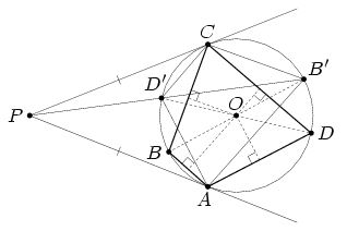 Пусть B' и D' – точки, симметричные B и D относительно центра окружности. По условию, прямая B'D' проходит через точку P пересечения данных касательных (см. рис.). Из подобия треугольников PD'C и PCB' следует, что PC : PB' = CD' : CB', а из подобия треугольников PD'A и PAB' –