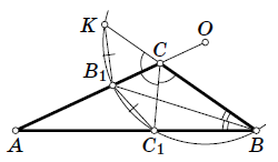 Продолжив луч BC до пересечения с описанной окружностью треугольника BB1C1, получим точку K (см. рис.). Вписанные углы ∠C1BB1 и ∠KBB1 равны (так как BB1 — биссектриса), значит, равны дуги, на которые они опираются, B1C1 = B1K. При этом точки K и C1 лежат на окружности (описанной вокруг треугольника BB1C1), центр которой принадлежит прямой AC. Следовательно, K и C1 симметричны друг другу относительно прямой AC. Получаем равенство трёх углов ∠BCC1 = ∠C1CB1 = ∠B1CK. Сумма этих углов равна 180°, стало быть, каждый из них равен 60°, и ∠ACB = ∠BCC 1 + ∠C1CB1 = 120°.