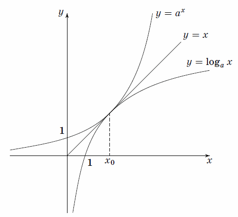 Рассмотрим графики функций $y = a^x$, $y = \log_a x$ (см. рис.). Поскольку эти функции взаимно обратны, каждая их общая точка либо лежит на прямой $y=x$, либо симметрична другой их общей точке относительно этой прямой. Но при $a > 1$ обе эти функции возрастают, поэтому точки $(x_0,y_0)$ и $(y_0,x_0)$ могут быть общими только при $x_0=y_0$. Следовательно, уравнение $a^x = \log_a x$ эквивалентно уравнению $a^x = x$.