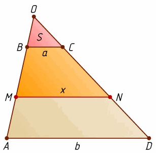 Пусть b > a. Отношение площадей трапеций BMNC и MADN равно 2 : 3, поэтому 3(x + a)h1 = 2(b + x)h2, откуда