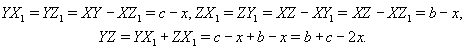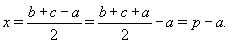 Докажем сначала следующее утверждение. Если в треугольник XYZ вписана окружность, а x – расстояние от вершины X до касания окружности со стороной XY и YZ = a, то x = p – a, где p – полупериметр треугольника.Обозначим точки касания вписанной окружности со сторонами XY, YZ и XZ через Z1, X1 и Y1 соответственно. Пусть XZ = b и XY = c. Тогда