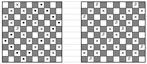 На левом рисунке нарисована одна "вертикальная" блоха В и все запрещённые положения "горизонтальных" блох (те, начиная с которых, "горизонтальная" блоха может оказаться с В на одной клетке). Как видим, запрещённые клетки образуют два прямоугольника, построенных на проходящих через В диагоналях. На правом рисунке размещены 10 "вертикальных" блох и все запрещённые ими положения "горизонтальных". Мы видим, что в каждой горизонтали осталась хотя бы одна незапрещённая белая клетка, куда можно посадить "горизонтальную" блоху.